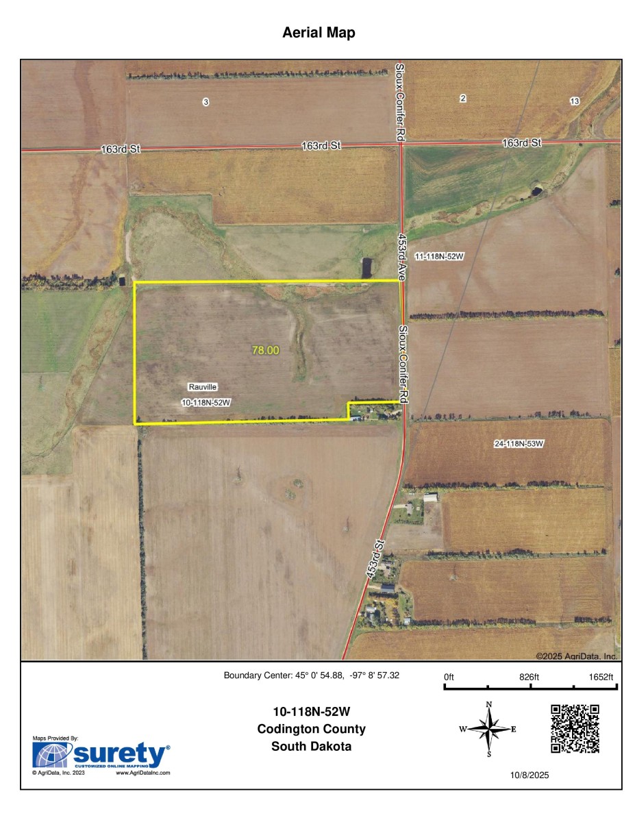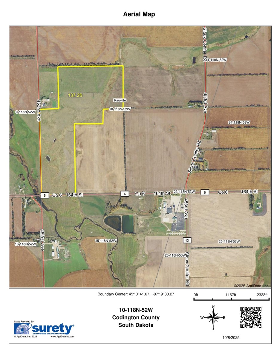 Terms: NO BUYER’s PREMIUM. 10% non-refundable earnest money down day of sale. Balance due at closing in 30 days or less – Must close in 2025. Possession given at closing. No exceptions or buyer contingencies of any kind – have financial arrangements secured prior to bidding. Lender’s Policy, if any, is the responsibility of the Buyer(s). Property is being sold based on taxable acres, more or less, not subject to survey. 2024 RE Taxes on the entire 215.25 Acres were $2856.78 – Title Insurance & closing agent fees split 50:50 between buyer & seller. Closing Agent: First Dakota Title-Watertown, SD. Property is being sold in as-is condition, subject to easements, reservations, restrictions & highways of record, if any. Property will be sold subject to approval of owners. Auctioneers are Real Estate Licensees acting as agents for the sellers in this transaction. Announcements on sale day take precedence over all written materials.